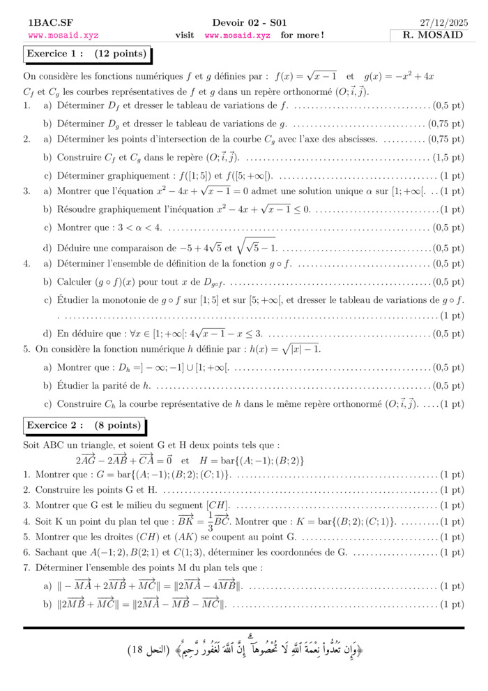 \item Montrer que : \( G = \text{bar} \{(A; -1) ; (B; 2) ; (C; 1)\} \). \dotfill (1 pt)