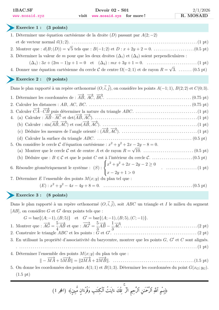 \item Montrer que : \( d(B; (D)) = \sqrt{5} \) tels que : \( B(-1; 2) \) et \( D : x + 2y + 2 = 0 \). \dotfill (0.5 pt)
