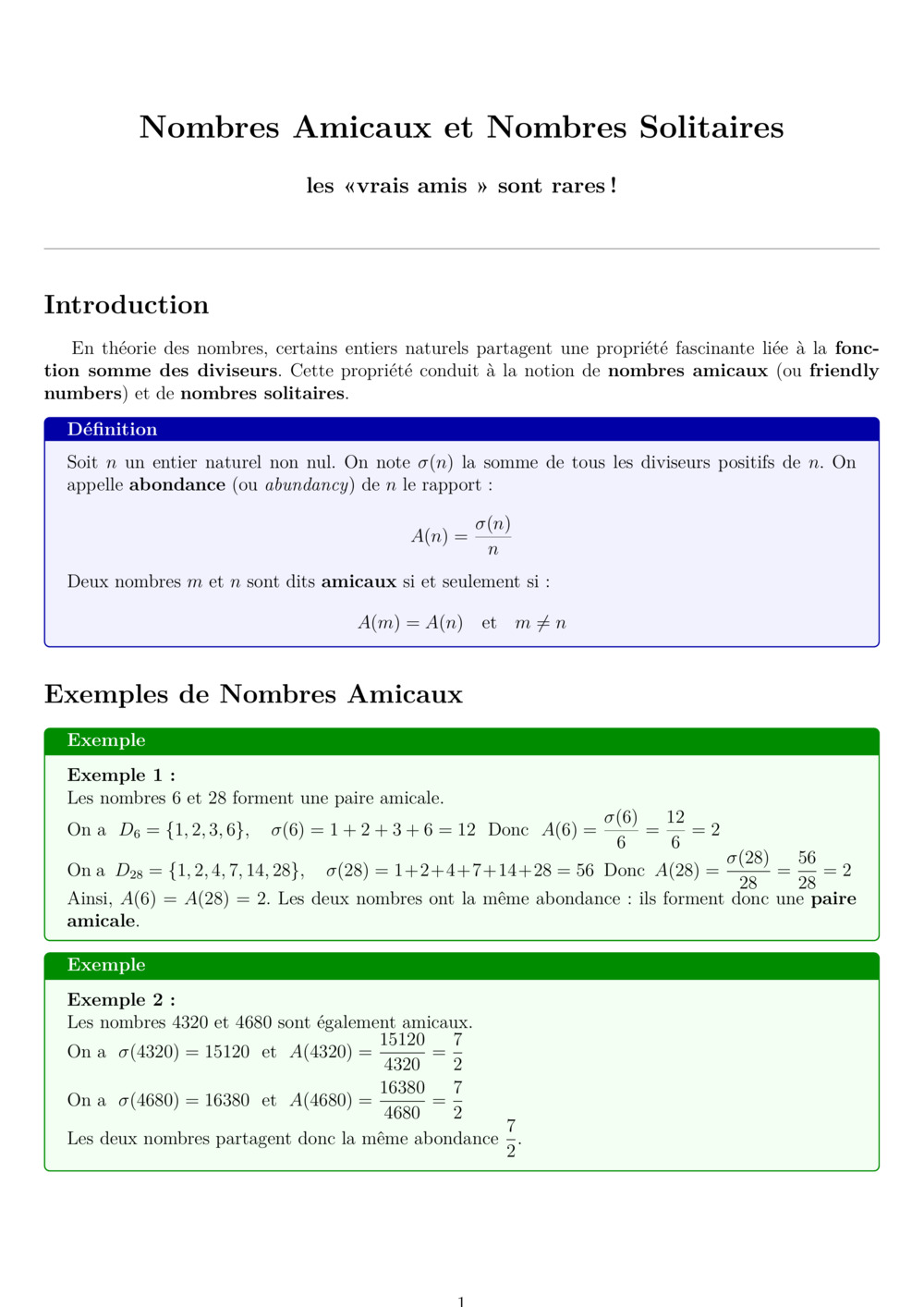 En théorie des nombres, certains entiers naturels partagent une propriété fascinante liée à la \textbf{fonction somme des diviseurs}. Cette propriété conduit à la notion de \textbf{nombres amicaux} (ou \textbf{friendly numbers}) et de \textbf{nombres solitaires}.