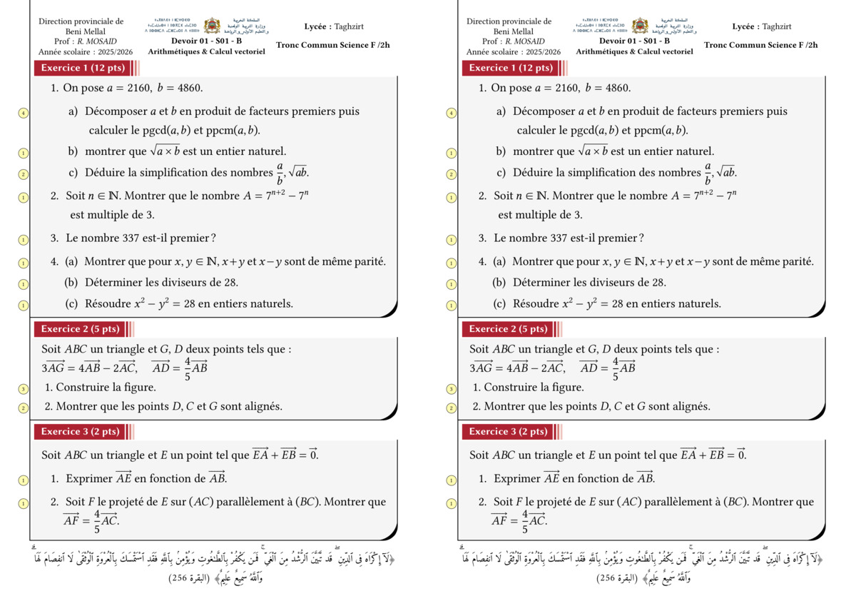 Control 01 S01 B, arithmétiques et Calcul vectoriel, 2025/2026