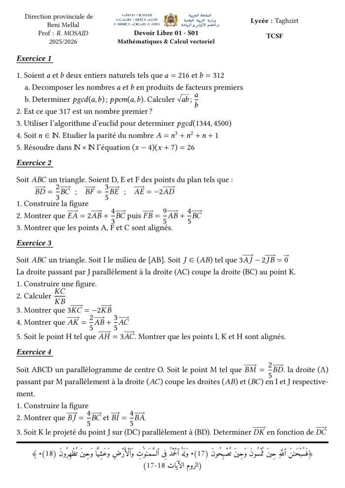 📥 Download Devoir Libre 01 S01, Arithmétiques et calcul vectoriel (PDF)